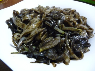 バターで炒めた玉ねぎにイカスミソースを加え、茹でたフィットチーネを入れてケチャップを投入...