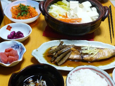 寄せ鍋:129kcal (木綿豆腐、白菜、長ねぎ、人参、ブナピー、ポン酢、柚子胡椒)