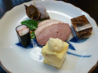 まずはお通し(鴨スモーク、蒸し玉子焼き、煮こごり、バイ貝のサッと煮、かにかまの海苔巻き風)