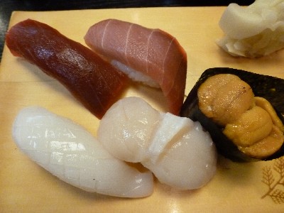 寿司(赤身、中トロ、いか、帆立、うに)