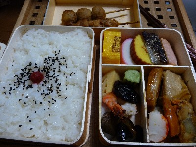 (ごはん、カリカリ梅、だし巻き玉子、かまぼこ、伊達巻、鮭、煮物〔たけのこ、ごぼう、椎茸、海老、麩〕、角煮、湯葉巻き、帆立照り焼き、かにかま)
