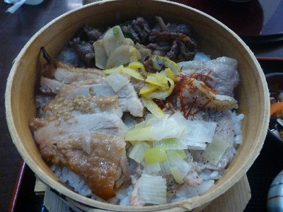 伊達鶏、エゴマ豚、酵母牛がのったわっぱ飯。