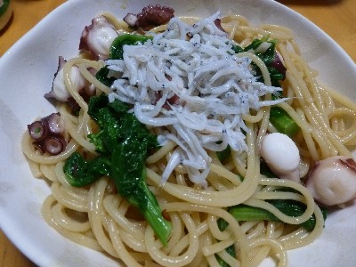 (スパゲティ、タコ、菜の花、しらす、にんにく、オリーブ油、パルメザンチーズ、タバスコ)