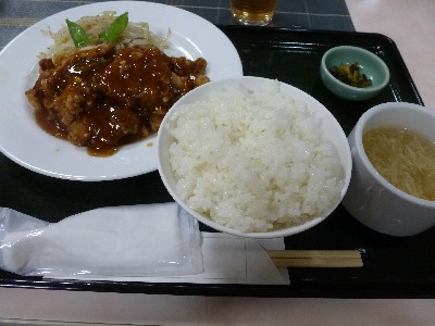 油淋鶏定食:776kcal(ごはん、かき玉スープ、油淋鶏・もやし、香物)