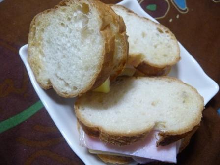 バケットを切って、間にハムとチーズをはさんでトースターで焼いた。