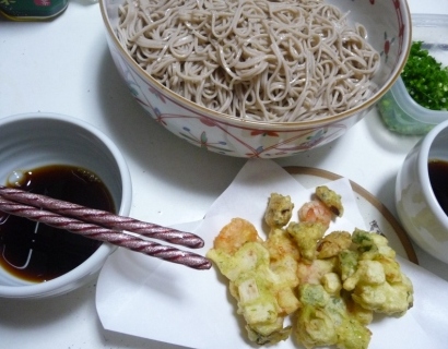 昨日揚げてもらったかき揚げと天ぷらを添えてもりそば。