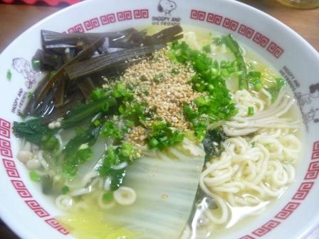 (サッポロ一番塩らーめん:443kcal 鯛だし+野菜(白菜・春菊・昆布・えのき・小ねぎ):60kcal)