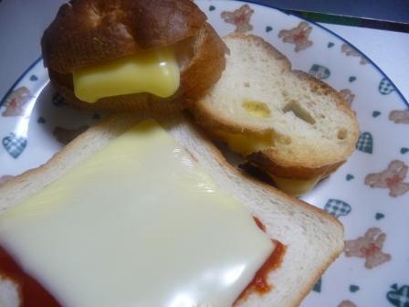 バケットは薄めに切って、切れてるチーズをはさんでトースターへ。