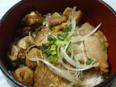 焼鳥&煮豚丼:680kcal (ごはん、焼鳥〔もも、つくね〕、煮豚、タレ、長ねぎ、小ねぎ)