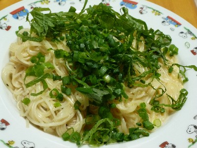 (そうめん、牛乳、バター、いかうに数の子、めんつゆ、小ねぎ、しそ)