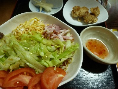 冷麺(冷やし中華)@蓬莱:554kcal (麺〔305kca〕、スープ〔72kca〕、ハム、錦糸卵、レタス、トマト、梅ペースト)