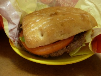 パティと野菜しか挟んでない状態になっていたので、家でケチャップ足しました。それはそれで美味い。
