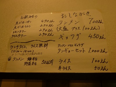 タンメン700円、ギョウザ450円・・・タンギョウセット1000円。