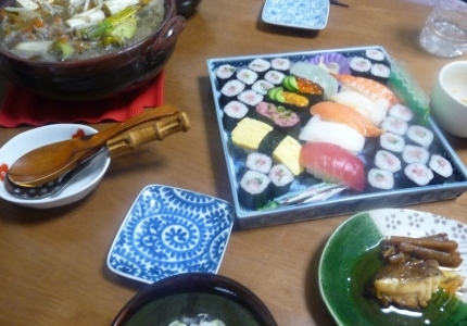 鍋と寿司、残っていたこんにゃく巻と鯛の煮付けをつまみ...終了。