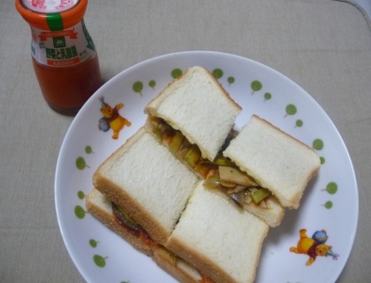 片方のパンにケチャップを塗り、ソテーを乗せて、さらにチーズをかぶせて焼き、