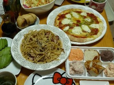 (スパゲティ、ベーコン、ひらたけ、しめじ、玉ねぎ、バター、醤油、パルメザンチーズ、タバスコ)