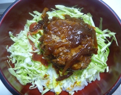 ごはんの上に千切りキャベツ、その上にハンバーグをどーん!