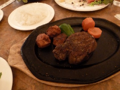 ステーキはヒレ、ミディアムレアで定食(+ごはん)にしました。