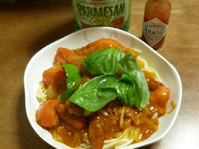 (スパゲティ、ミートソース〔レトルト〕、ボロネーゼ〔レトルト〕、チョリソー、トマト、玉ねぎ、バジル、バター、オリーブ油、オイスターソース、パルメザンチーズ、タバスコ)