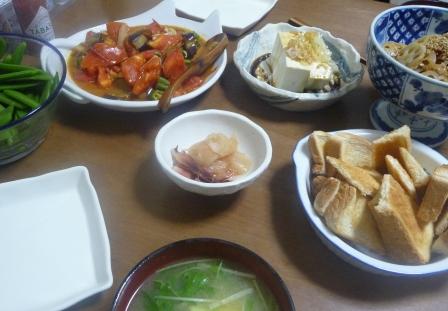 トマトとなす、おくらとエリンギのガーリックソテーにトーストを添えて。