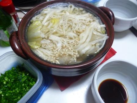 鶏鍋のだしに半生のきしめんを入れて釜揚げ風。きしめんについていためんつゆ使用。