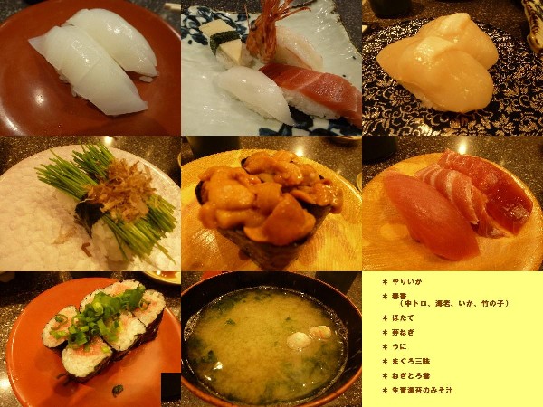 (やりいか、春香(まぐろ・海老・竹の子・いか+鯛)、ほたて、芽ねぎ、うに、まぐろ三昧、ねぎとろ巻)