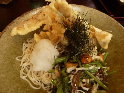 冷やし山菜そば(そば、ごぼう天、山菜、大根おろし、海苔、そばつゆ、長ねぎ、わさび)