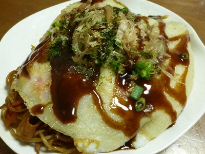 焼きそばの上に生地が乗っているという本来の広島風お好み焼きっぽくなった(笑)