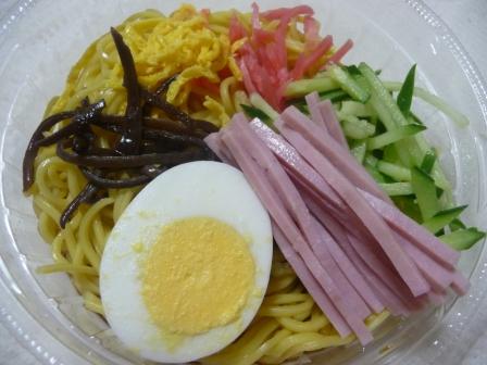 冷し中華(ハム、錦糸卵、ゆで卵、きゅうり、きくらげ、きゅうり、紅しょうが)。
