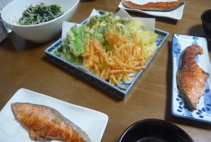 天ぷらはにんじん、玉ねぎ、れんこん、たらの芽、こごみ、モロッコインゲンの6種。