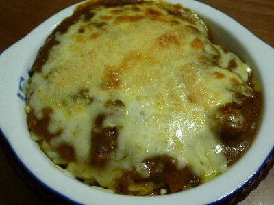 ごはんにカレーを混ぜ込んでグラタン皿に入れて、カレーのルーのみをたっぷり掛けて・・・