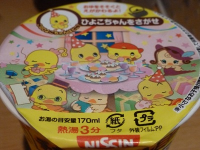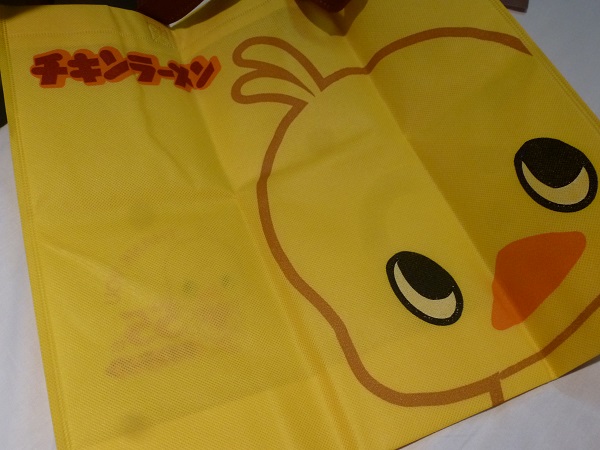 ローソンで『チキンラーメン関連商品を2個ご購入すると「ひよこちゃんエコトートバッグ」がもらえる』ということで、買ってもらいました。 不織布製です♪ 【チキンラーメン ミニ ひよこカップ】 販売元:日清食品 購入場所:ローソン 値段:105円(税込) 内容量:32g(めん30g) カロリー:143kcal