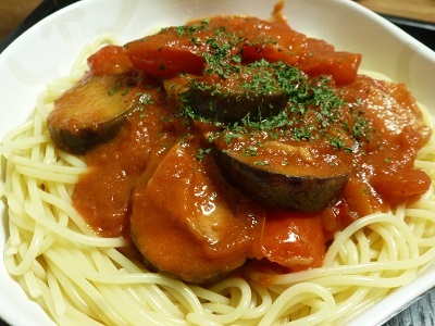 トマトとなす、ハムのスパゲティ