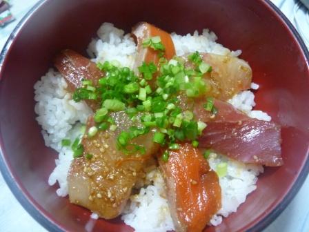 ごはん 190g / 刺身 各30g(まぐろ・さけ・はまち)/ 漬けだれ(しょうゆ・みりん・粉末だし・すりごま・わさび)