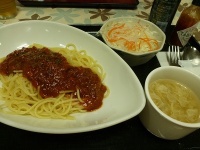 ミートソーススパゲティ〔サラダ・スープ付き〕(625kcal)