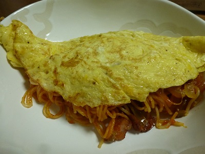 オムナポリタン〔ナポリタン(残り)、オムレツ(たまご2個、牛乳、塩こしょう、バター、オリーブ油)〕
