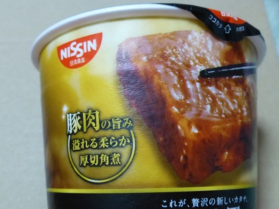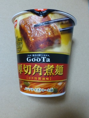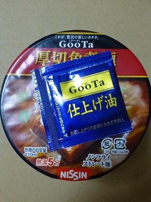 収納庫に入っていたGooTa 具に驚きのあるカップ麺 = 「日清GooTa」がたて型カップ麺で新登場!! 【GooTa 厚切角煮麺】 販売元:日清 購入場所:ー 値段:237円(税別) 内容量:97g(麺75g) カロリー:378kcal(めん・かやく 334kcal/スープ 44kcal) ふたの上には仕上げ油の小袋が付属。