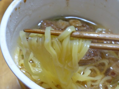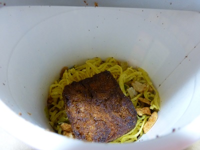 「豚肉の旨み 溢れる柔らか厚切角煮」 パッケージの豚角煮を見る限り、かなり期待度が・・・ 開けるとノンフライストレート麺にフリーズドライの肉がドーン。 スープは粉末、細かいねぎがポロポロと。 お湯の目安量は410mlで熱湯5分 5分後・・・