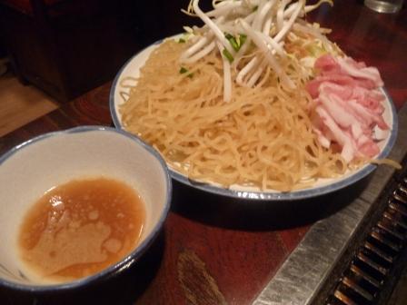 まずは肉・野菜を炒め、火が通ったら広げて麺を乗せる。