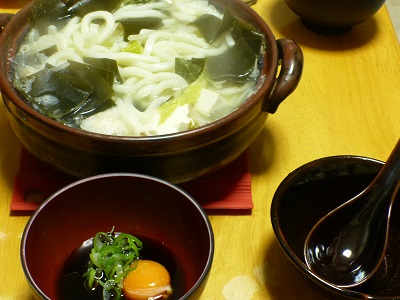 (玉うどん、絹ごし豆腐、柚子入り鶏団子、白菜、長ねぎ、もやし、大根、つけつゆ[ポン酢、卵黄、長ねぎ〕)