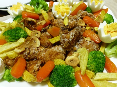 からあげプレート(からあげ、ポテトフライ、ゆで卵、人参のグラッセ、ブロッコリー)