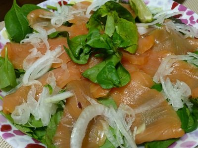 スモークサーモンのサラダ(スモークサーモン、オニオンスライス、ベビーリーフ、ドレッシング)