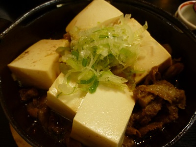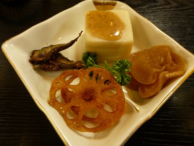 お通し(小魚の佃煮、胡麻豆腐、大根の薄切り煮、れんこんの素揚げ)