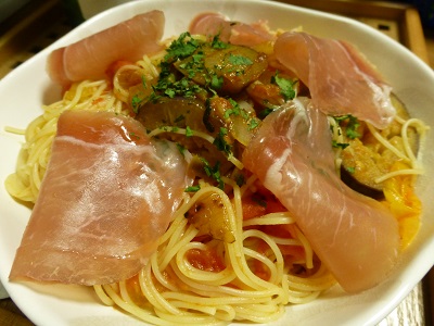 (カッペリーニ、なす、トマト、玉ねぎ、生ハム、にんにく、アンチョビ、オリーブ油、パルメザンチーズ、タバスコ)