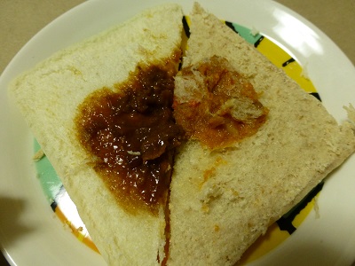 白いパンにはビーフストロガノフを全粒粉入りパンにはボルシチ風フィリングをサンドしました。