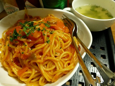 (スパゲティ、ハム、玉ねぎ、ピーマン、ケチャップ、バター、パルメザンチーズ、タバスコ)