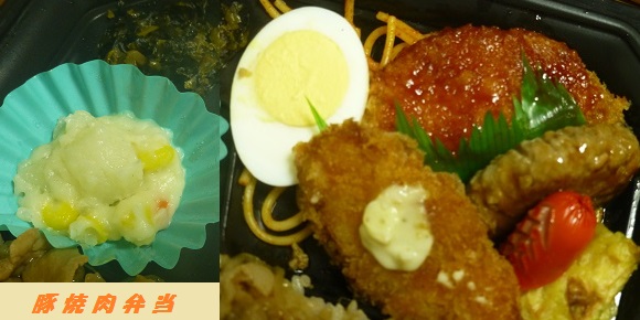 コーン入ポテトサラダ、磯ちくわ天ぷら、ウインナーソーセージ揚、味付高菜