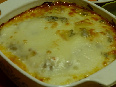 オーブンから取り出すとチーズが溶けてグツグツいってた。