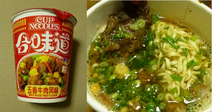 (CUP NOODLE 合味道 五香牛肉風味、スペアリブの黒酢煮、小ねぎ)