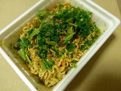 (ぺヤングやきそば〔518kcal〕 、長ねぎ、小ねぎ、香菜、スイートチリソース、レモン汁、唐辛子)